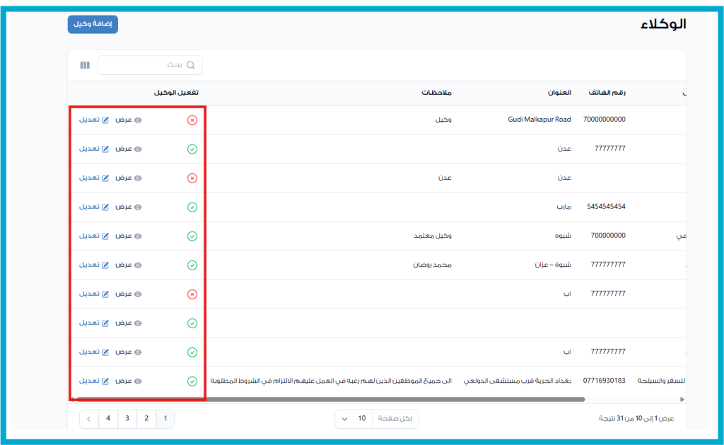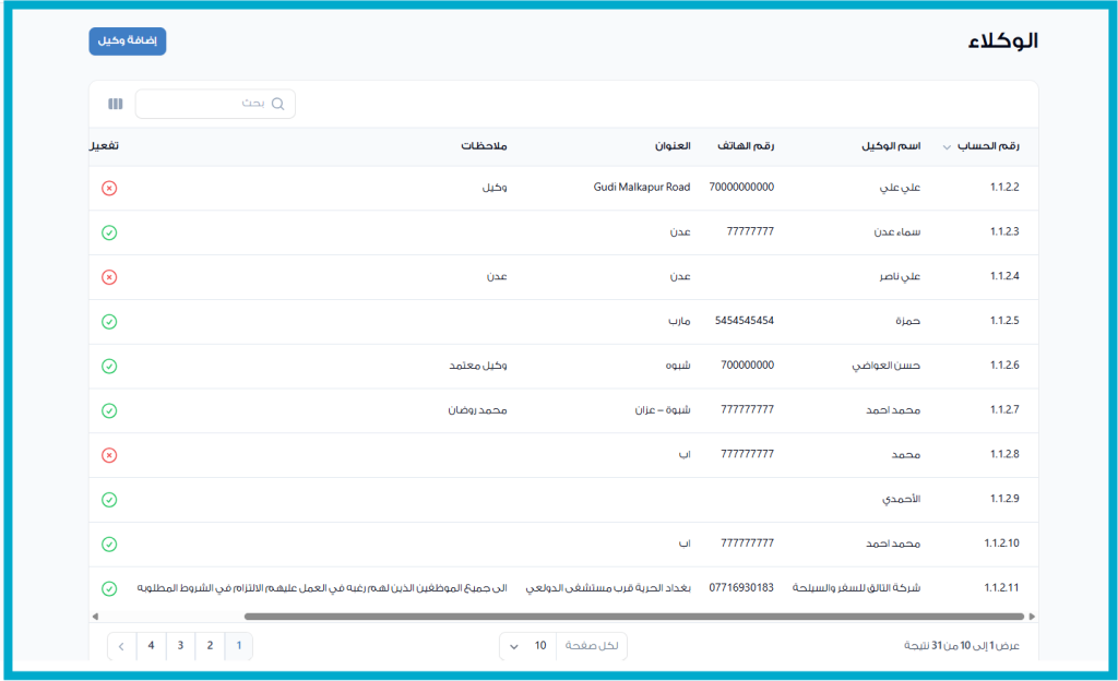 من صفحة “الوكلاء” يمكنك الاطلاع على قائمة شاملة تحتوي على جميع الوكلاء المسجلين في النظام، مع إمكانية البحث أو التعديل أو إضافة وكيل جديد.