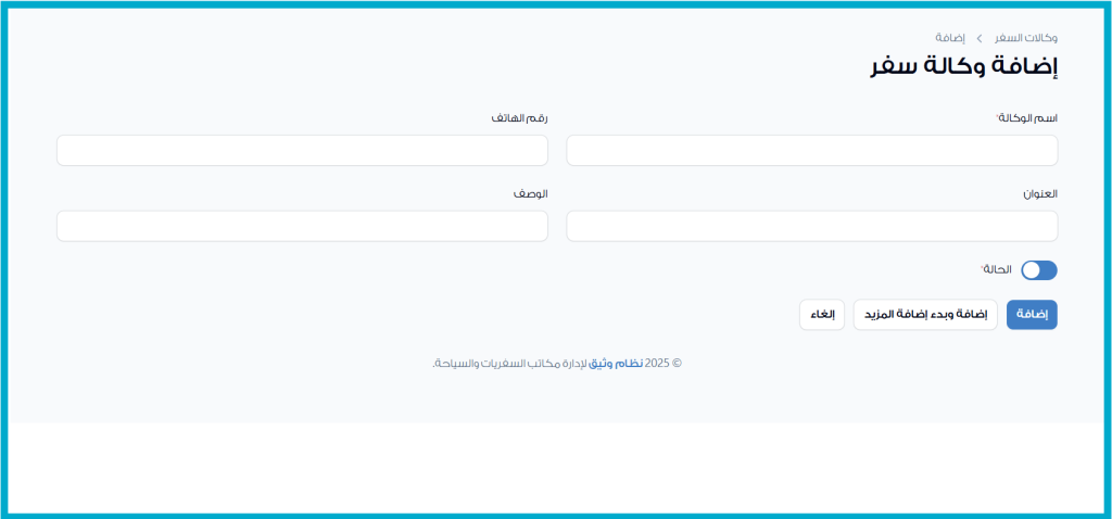 عند التعاقد مع وكالة جديدة أو بدء تعاون جديد، يمكنك إضافتها مباشرة إلى النظام من خلال واجهة إضافة وكالة سفر لتظهر ضمن قائمة الوكالات المعتمدة.