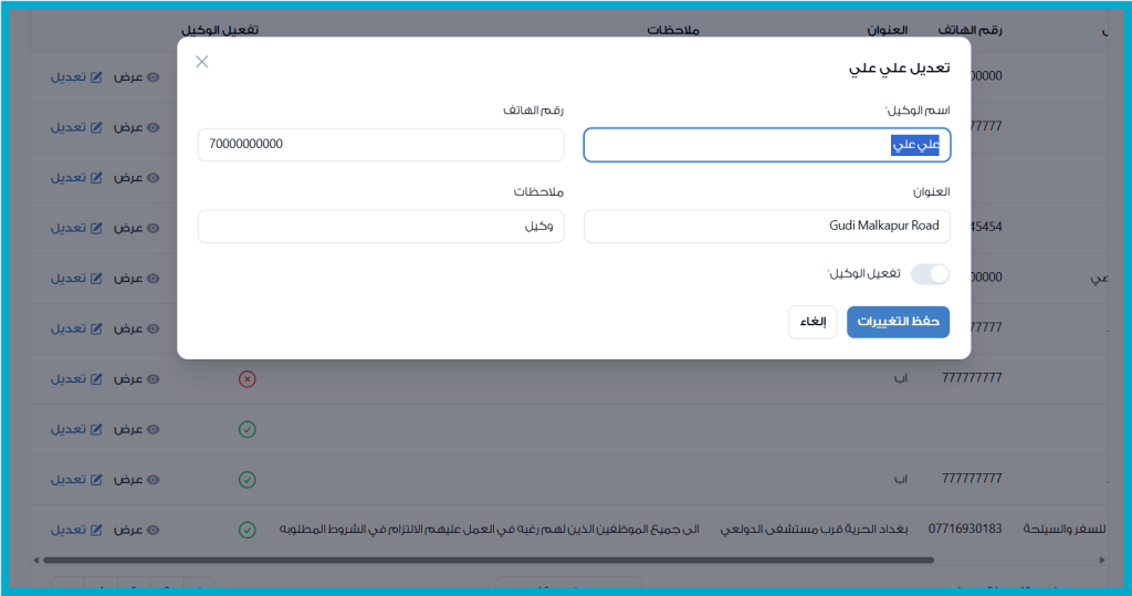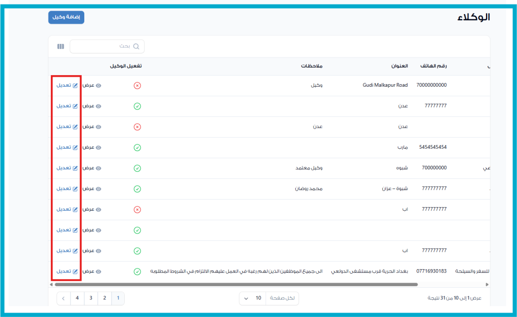 في بعض الحالات، قد تحتاج إلى تحديث بيانات الوكلاء المسجلين، مثل تغيير الاسم، رقم الهاتف، العنوان، أو حالة التفعيل.