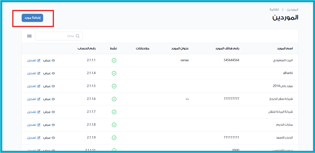 من صفحة الموردين، اضغط على زر “إضافة مورد” في أعلى الصفحة. ستفتح لك نافذة خاصة لإدخال بيانات المورد الجديد.