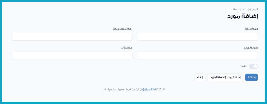 حدد خيار “نشط” إذا كان المورد جاهزًا للتعامل المباشر. يمكنك لاحقًا تعطيله مؤقتًا إن لزم الأمر دون حذفه من النظام.