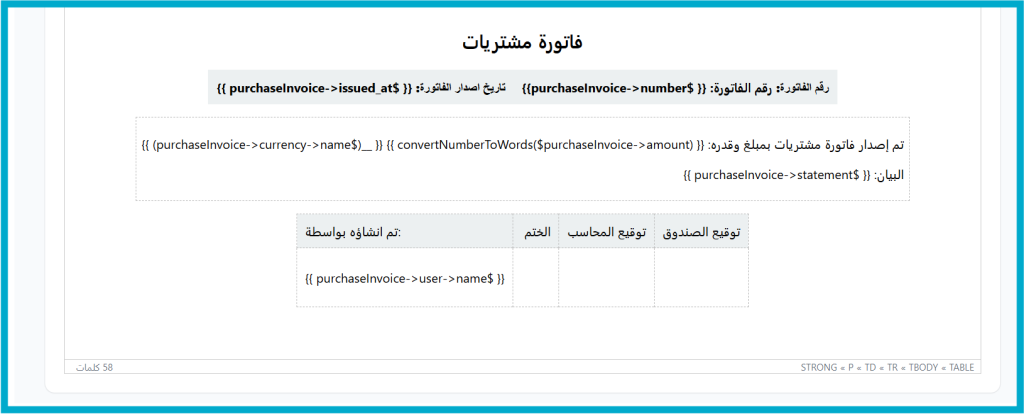 الحقول المتاحة لتخصيص نص الفاتورة: