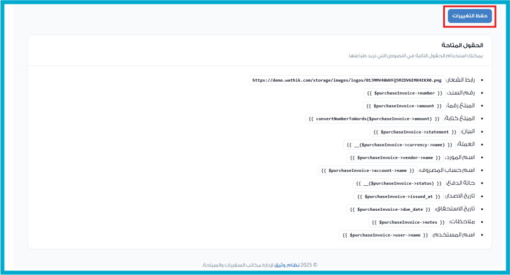 بعد تخصيص الإعدادات والحقول، اضغط حفظ التغييرات لتطبيق الإعدادات على جميع فواتير الشراء المستقبلية.