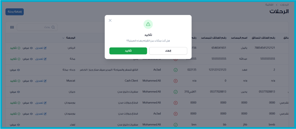 عند الضغط على زر “تأكيد” بجانب الرحلة، سيظهر تنبيه للتأكد من رغبتك في تنفيذ هذه العملية.