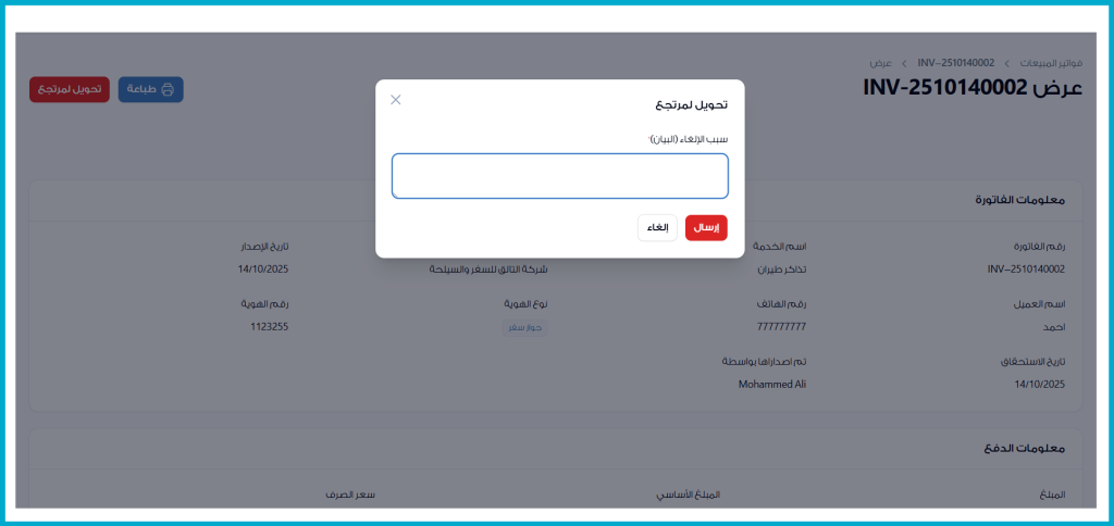 في بعض الحالات قد تحتاج الفاتورة الصادرة إلى التعديل أو الإلغاء، سواء بسبب خطأ في الخدمة، طلب العميل، أو أي سبب آخر. يوفر النظام ميزة تحويل الفاتورة إلى مرتجع بطريقة سهلة وآمنة مع توثيق سبب الإلغاء، لضمان متابعة المحاسبة بشكل دقيق.