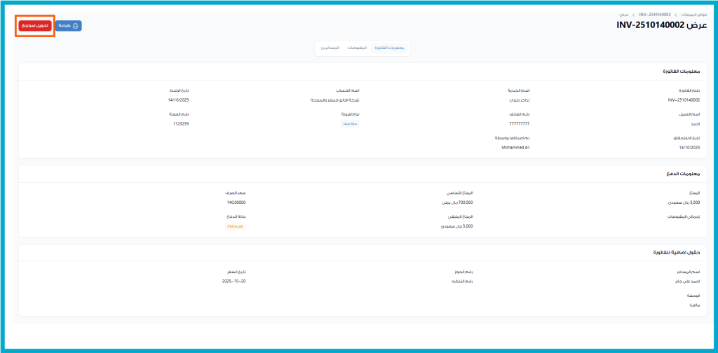 4- سيتم تحديث حالة الفاتورة داخل النظام تلقائيًا لتصبح مرتجع مع الاحتفاظ بكل تفاصيلها الأصلية.