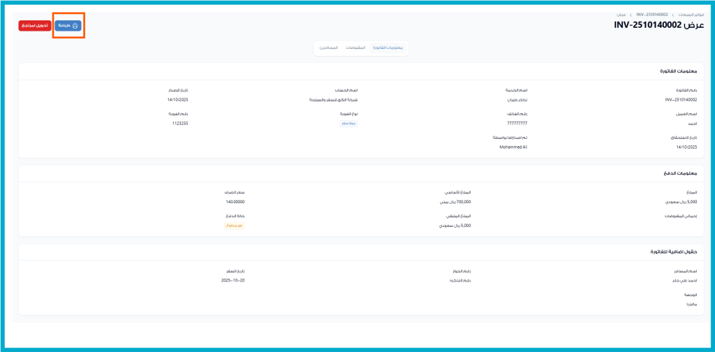 2- عرض تفاصيل الفاتورة: قبل الطباعة، يمكنك مراجعة جميع تفاصيل الفاتورة مثل اسم العميل، رقم الفاتورة، الخدمات، المبالغ، وحالة الدفع.
