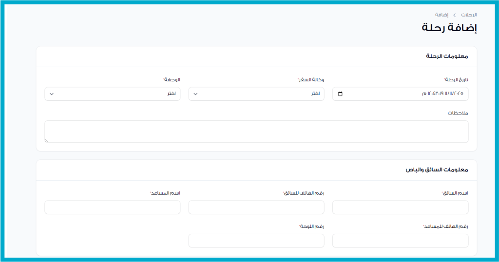 صفحة إضافة رحلة تمكّنك من تسجيل الرحلات الجديدة بطريقة منظمة وسريعة، لتبقى كل المعلومات المهمة محفوظة في مكان واحد.