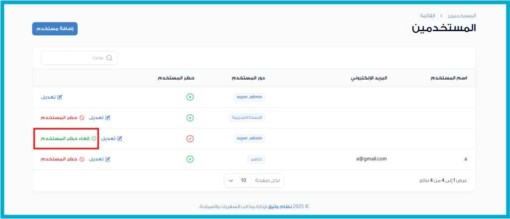 من خلال خاصية الحظر، يمكنك التحكم الكامل في صلاحيات المستخدمين داخل وثيق، مما يوفر بيئة أكثر أمانًا وتنظيمًا للمؤسسة. التحكم الذكي بالمستخدمين هو أحد مفاتيح النجاح في إدارة الأنظمة الحديثة.