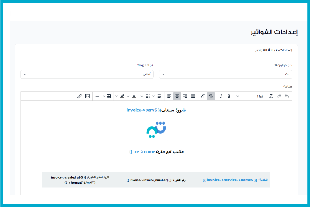 ستظهر لك صفحة تحتوي على خيارات تخص طباعة الفواتير وضبط شكلها الأساسي.