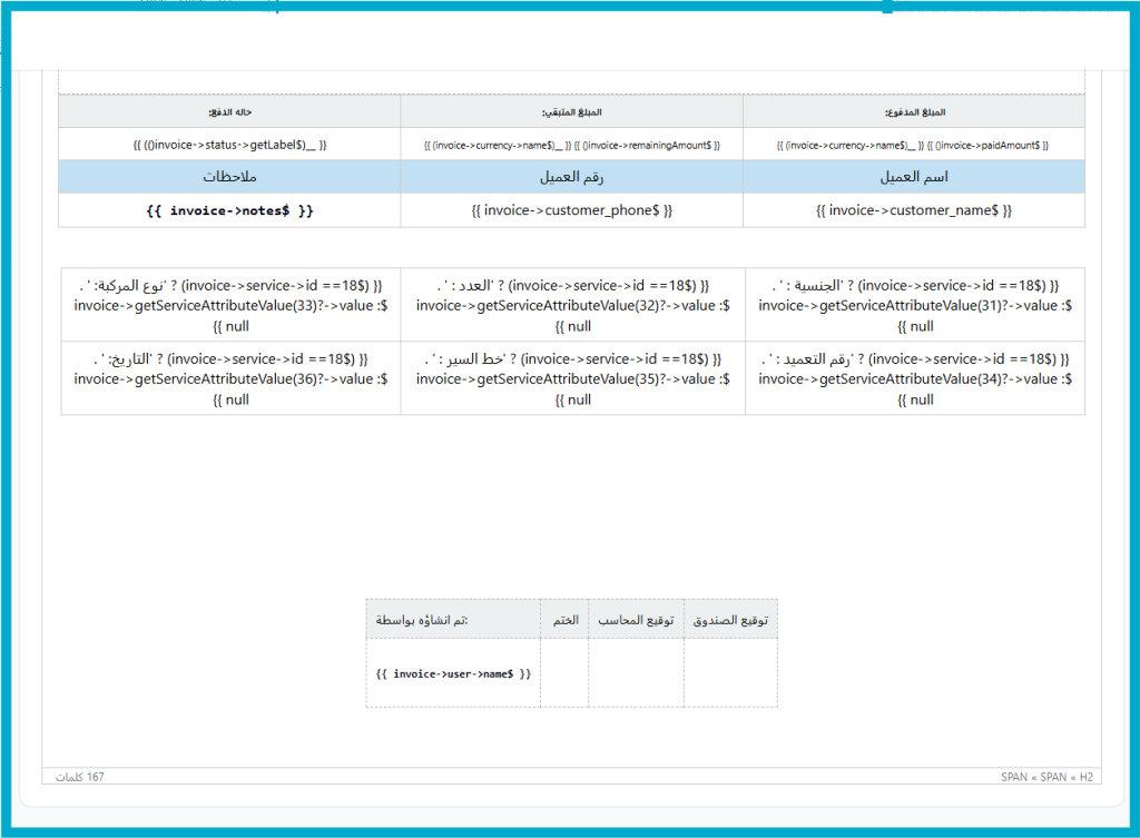 يمكنك إدراج مجموعة من الحقول الديناميكية داخل نص الفاتورة لتظهر تلقائيًا عند الطباعة.