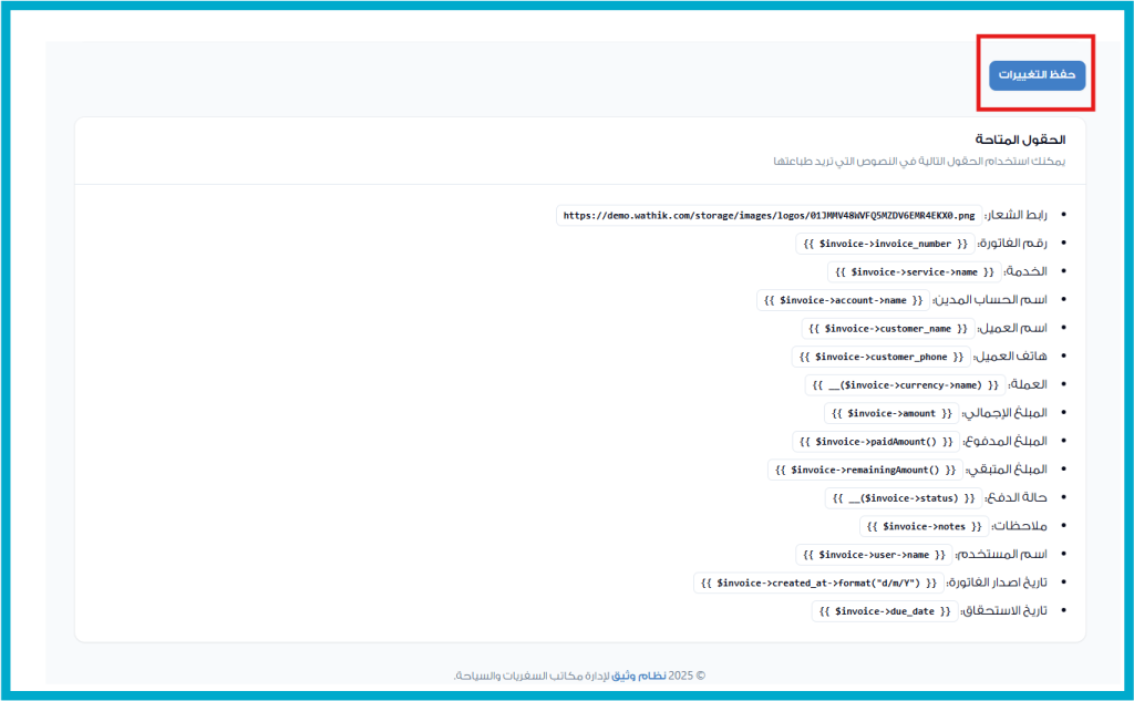بعد الانتهاء من تخصيص الإعدادات والحقول، اضغط على حفظ التغييرات ليتم تطبيق الإعدادات الجديدة على جميع الفواتير المستقبلية.