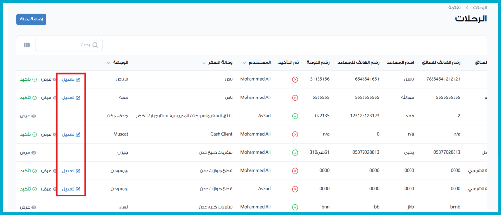 يمكنك فتح صفحة التعديل من خلال الضغط على زر “تعديل” بجانب الرحلة في قائمة الرحلات.