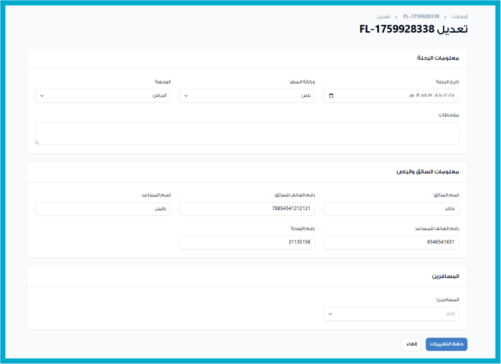 صفحة تعديل الرحلة صُمّمت لتمنحك المرونة الكاملة في تحديث كل التفاصيل بسهولة، مع الحفاظ على دقة البيانات واستمرارية السجلّات دون أي ارتباك.
