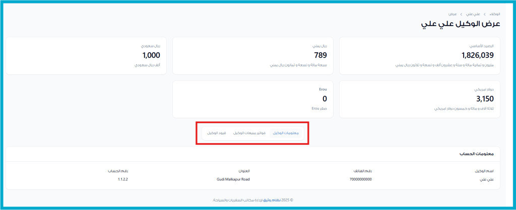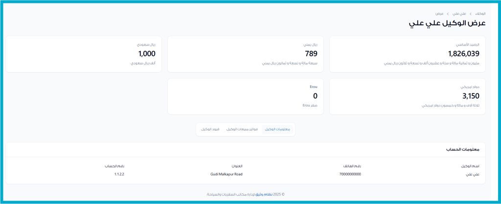 صفحة عرض الوكيل توفر لك كل التفاصيل حول الوكيل، من معلومات الاتصال إلى الرصيد الحالي، بالإضافة إلى فواتير المبيعات والقيود المرتبطة به.