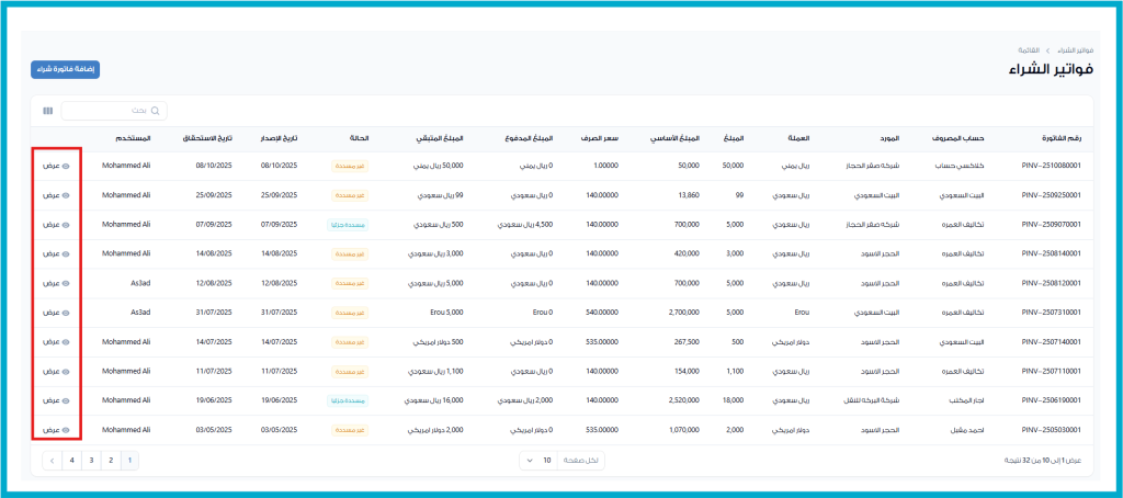 من خلال صفحة فواتير الشراء، يمكنك الاطلاع على قائمة بجميع الفواتير المسجلة في النظام، بما في ذلك رقم الفاتورة، المورد، المبلغ، العملة، وحالة الدفع (مسددة، غير مسددة، جزئيًا).