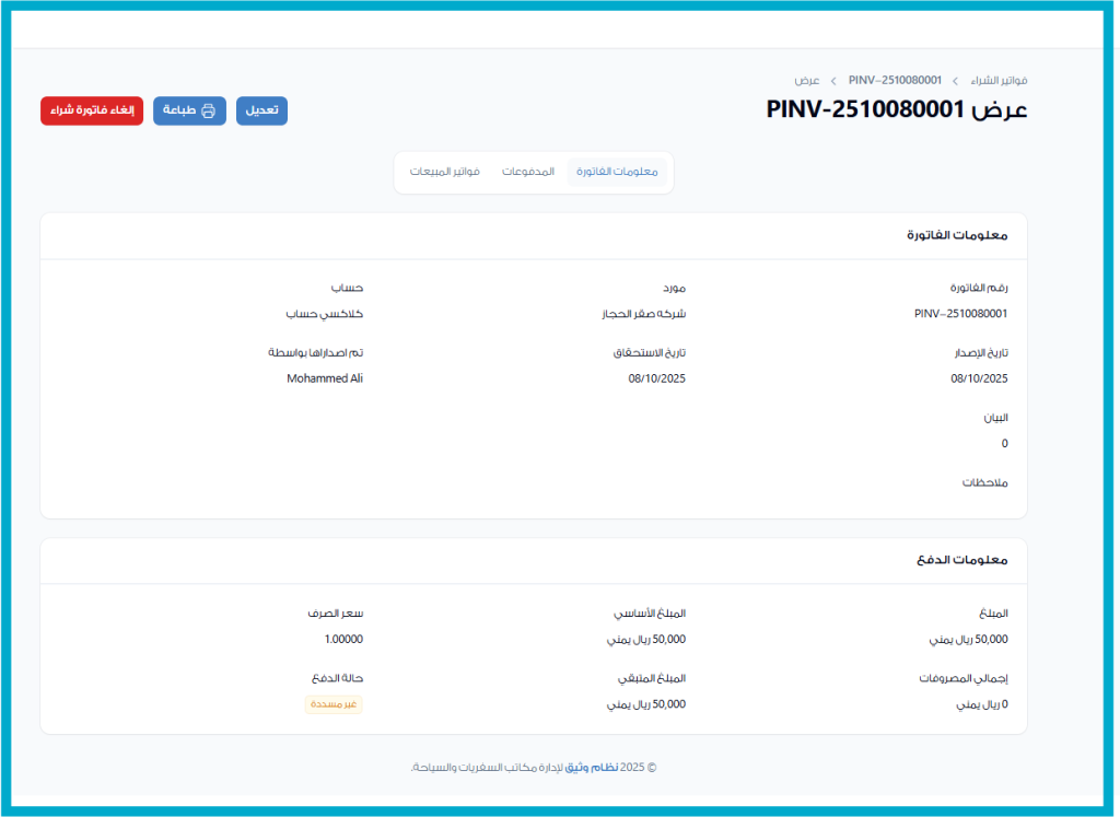 ميزة عرض الفواتير تمنحك رؤية مالية متكاملة تساعدك على تتبع جميع التزاماتك الشرائية بدقة دون عناء. - تعديل الفاتورة في حال الحاجة لتحديث أي بيانات.