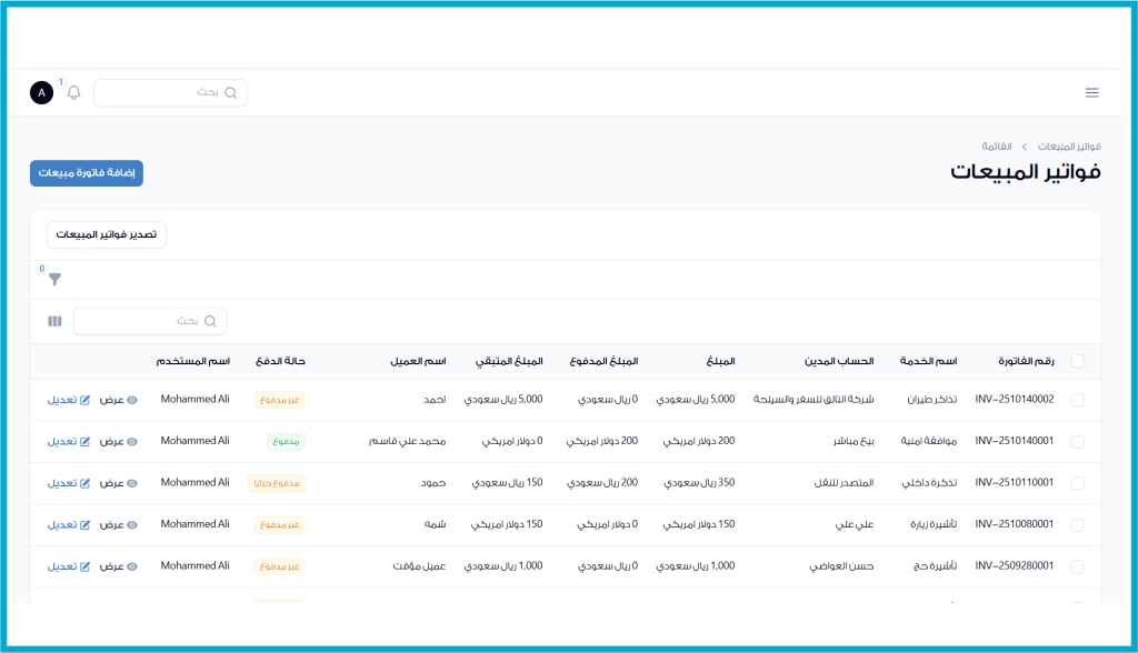 تمنحك صفحة فواتير المبيعات أداة قوية لإدارة الجانب المالي في أعمال السفر والسياحة أو الخدمات. سواء كنت تراجع المدفوعات، تضيف فواتير جديدة، تعدّل بيانات، أو تبحث عن فاتورة معينة، ستجد جميع الأدوات مرتّبة بطريقة واضحة تمنحك تحكّمًا كاملاً وسهولة في الاستخدام.