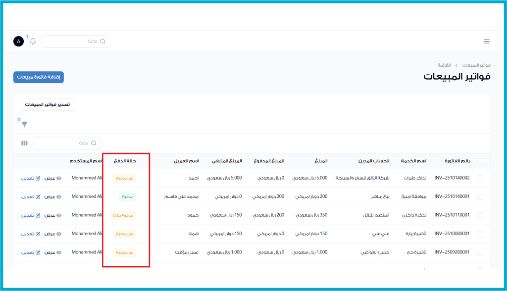 تعرض الصفحة حالة كل فاتورة بدقة، وتشمل:
