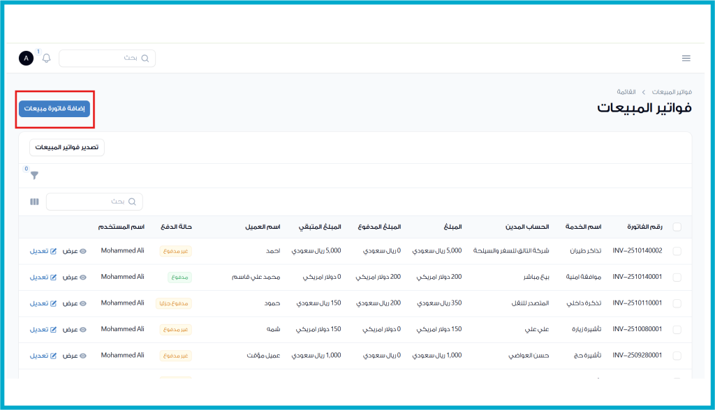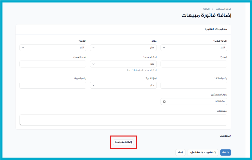 - اضغط إضافة لإتمام العملية، وسيتم تحديث حالة الفاتورة تلقائيًا حسب المدفوع.