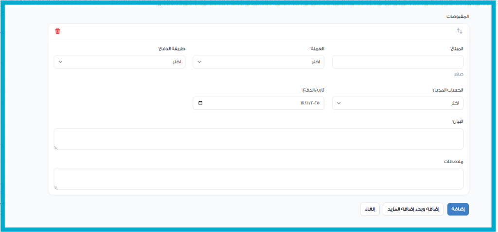 عند فتح أي فاتورة، ستجد قسمًا مخصصًا بعنوان المقبوضات، وهو مساحة شاملة تتيح لك: